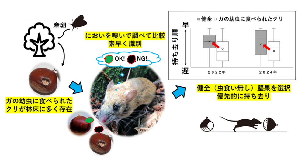 野ネズミはクリの虫食いの有無を、素早く嗅ぎ分ける~ガの幼虫が食べた堅果を避けることを野外で実証~(梶村恒教授他)