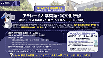 本事業では、多民族・多文化共生社会を実現するオーストラリアにおいて、国際的な共同研究を積極的に推進し、世界トップレベルの学術研究を展開するパートナー大学(アデレード大学、西オーストラリア大学、モナシュ大学、クイーンズランド大学)との間で、多様な文化的・学術的背景を持つ学生が主体的な共修を行う双方向性の研究教育交流プログラムを実施することにより、ポストSDGs時代のアジア太平洋経済安全保障に貢献できる自律協働型国際プロフェッショナル人材を養成することを目標とします。