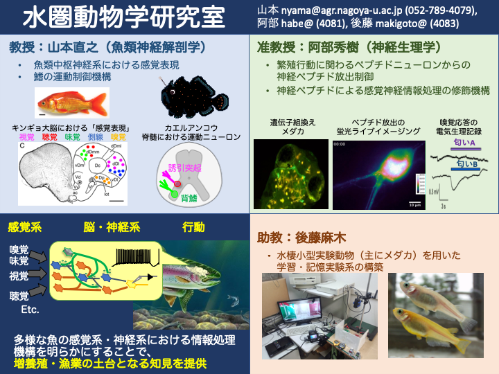 脳内で作り出される神経ペプチドが脳というコンピュータの中でどんな機能を果たしているのかということは、魚に限らず動物一般的に未だ殆ど明らかになっていません。このメカニズムを知ることで、水産資源や生物多様性の保全に役立つ動物にとって優しい生体機能・行動制御方法の開発を目指しています。