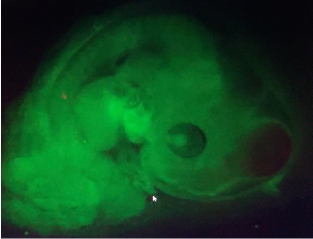 | 名古屋大学院工学研究科化学・生物工学専攻の西島謙一研究室で作出された始原生殖細胞特異的に蛍光タンパク質 (eGFP) を発現するトランスジェニックニワトリ。 |