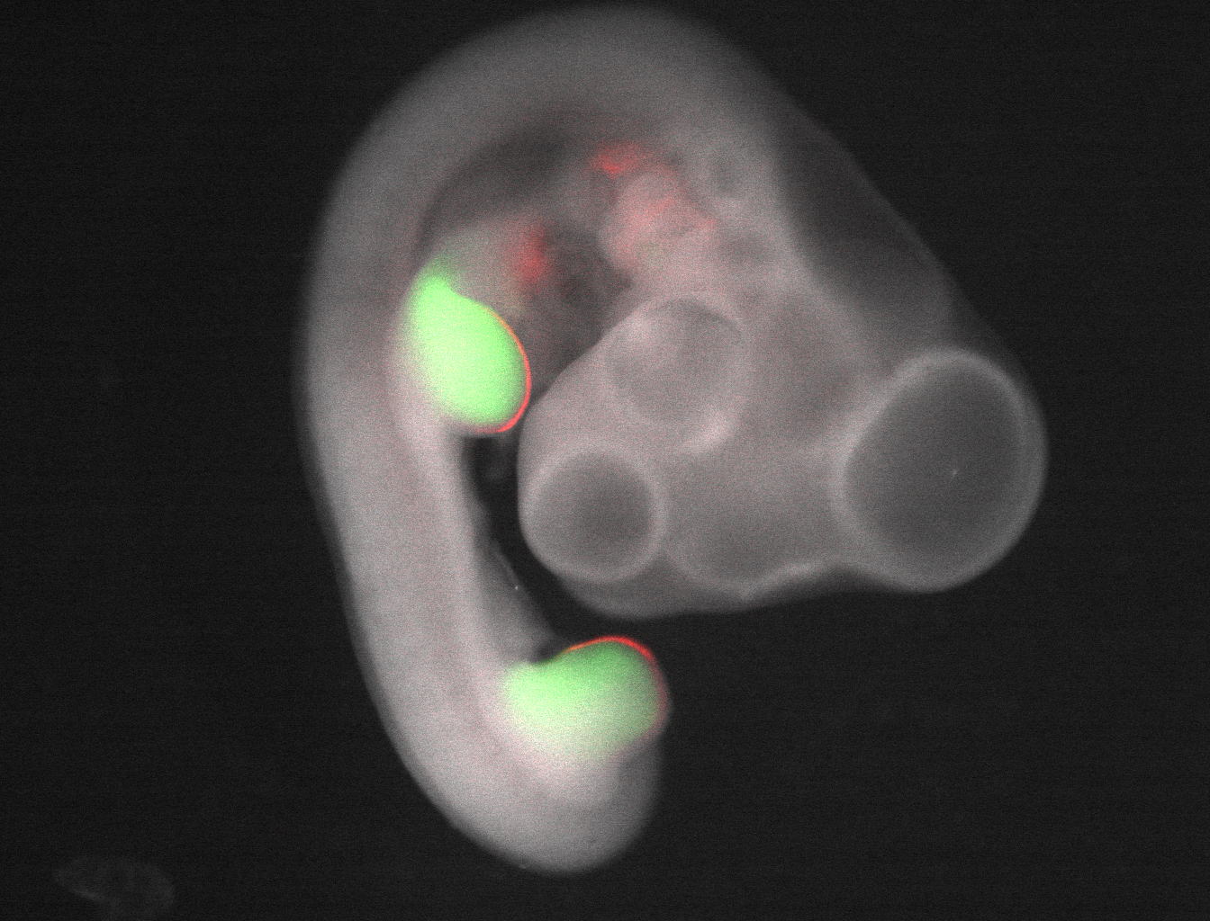 | 九州大学の熱田勇二先生らにより作出された蛍光タンパク質発現トランスジェニックニワトリで、肢芽のうち四肢前駆細胞がZsGreenで、外胚葉性頂堤(AER)がDsRedでラベルされている。 with Green and Red fluorescent proteinsからとられている。 |