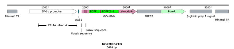 | 細胞内カルシウム濃度に応じて蛍光強度が変化するGCaMPをユビキタスに発現するトランスジェニックニワトリ。ヒトEF1αプロモーターにより、蛍光強度の高いGCaMP6sを発現する。